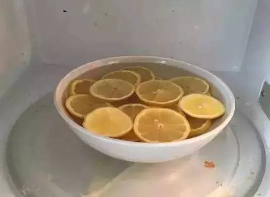 檸檬切片,放入可微波的碗中,加入4~5 湯匙醋,加滿水。將碗放入微波爐內, 開高火微波5-10分鐘。將碗拿出來后, 用干凈的濕抹布就能輕松擦掉微波爐內的油漬啦!