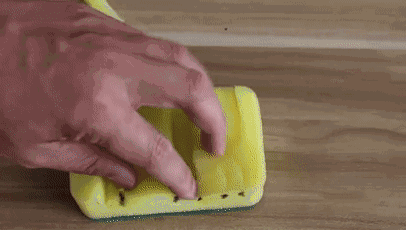 先把海綿放在窗沿上,用筆沿著凹凸處一一描點標(biāo)記,再用剪刀沿著點修剪海綿,使其剛好能安放在窗縫處。倒入適量清潔劑,放上修好的海綿來回擦拭,不用多久就很干凈啦!