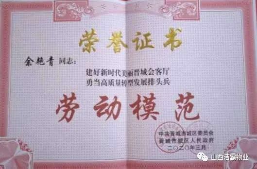 余艷青同志自2015年進入潔霸以來,一直奮斗在工程部的第一線從事主管工作。工作中,余艷青同志愛崗敬業(yè),遵守職業(yè)道德,為人誠實守信;她熱愛工作,對待客戶熱情周到、耐心細致;工作中團結同事,責任心強,吃苦耐勞,服從大局,以公司的利益為重。在我市開展的“三洗六見一紅旗”活動和全國文明城市的創(chuàng)建活動中,她帶領員工高標準、高質量、高效率地完成清洗美化工作,為扮靚晉城形象,打造城市優(yōu)美環(huán)境做出了突出貢獻。先后多次被公司評為優(yōu)秀員工等,2019年在公司成立20周年慶之際,她又被公司授予“潔霸工匠”稱號。