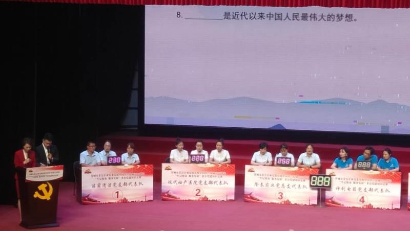 決賽現(xiàn)場(chǎng),比賽以“步步為贏”必答題、“爭(zhēng)分奪秒”速答題、“眼疾手快”搶答題、“挑戰(zhàn)自我”風(fēng)險(xiǎn)題、“一錘定音”加賽題等比賽方式,有效調(diào)動(dòng)了全員參與熱情,提升了現(xiàn)場(chǎng)氣氛。競(jìng)賽還設(shè)有公正席和評(píng)委席負(fù)責(zé)監(jiān)督整個(gè)比賽進(jìn)程,并對(duì)比賽中有爭(zhēng)議的題目或選手回答不準(zhǔn)確的題目進(jìn)行最終裁決。六支隊(duì)伍認(rèn)真參與,積極答題。在“挑戰(zhàn)自我”風(fēng)險(xiǎn)題環(huán)節(jié),我公司黨支部代表隊(duì)成員閆晶晶沉著應(yīng)對(duì),選擇最高分值題目并準(zhǔn)確說(shuō)出習(xí)近平新時(shí)代中國(guó)特色社會(huì)主義的14條基本方略完成答題,迎來(lái)了觀賽者的熱烈掌聲,展現(xiàn)了潔霸清潔黨支部代表隊(duì)日常學(xué)習(xí)的扎實(shí)以及向黨組織靠攏的熱情和決心。經(jīng)過(guò)一個(gè)多小時(shí)的比拼,我公司黨支部代表隊(duì)獲得比賽三等獎(jiǎng)。