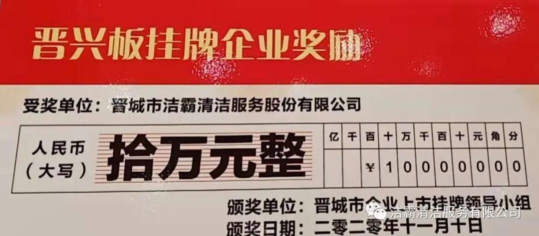 晉城市潔霸清潔服務(wù)股份有限公司于2019年11月27日成功登陸山西股權(quán)交易中心“專精特新板”(晉興板)(企業(yè)代碼:060200Z),是“專精特新板”開板暨首批掛牌的14家企業(yè)之一!皩>匦掳濉笔巧轿鞴蓹(quán)交易中心設(shè)立的特色板塊,為省內(nèi)具備專業(yè)化、精細化、特色化、新穎化的優(yōu)質(zhì)企業(yè)提供專屬服務(wù),成為帶動全省中小企業(yè)創(chuàng)新創(chuàng)造、轉(zhuǎn)型升級,壯大工業(yè)高質(zhì)量發(fā)展的生力軍。“晉興板”掛牌,標志著公司正式進軍資本市場,豐富了融資渠道,推動公司高質(zhì)量轉(zhuǎn)型發(fā)展,成為公司發(fā)展的新引擎。