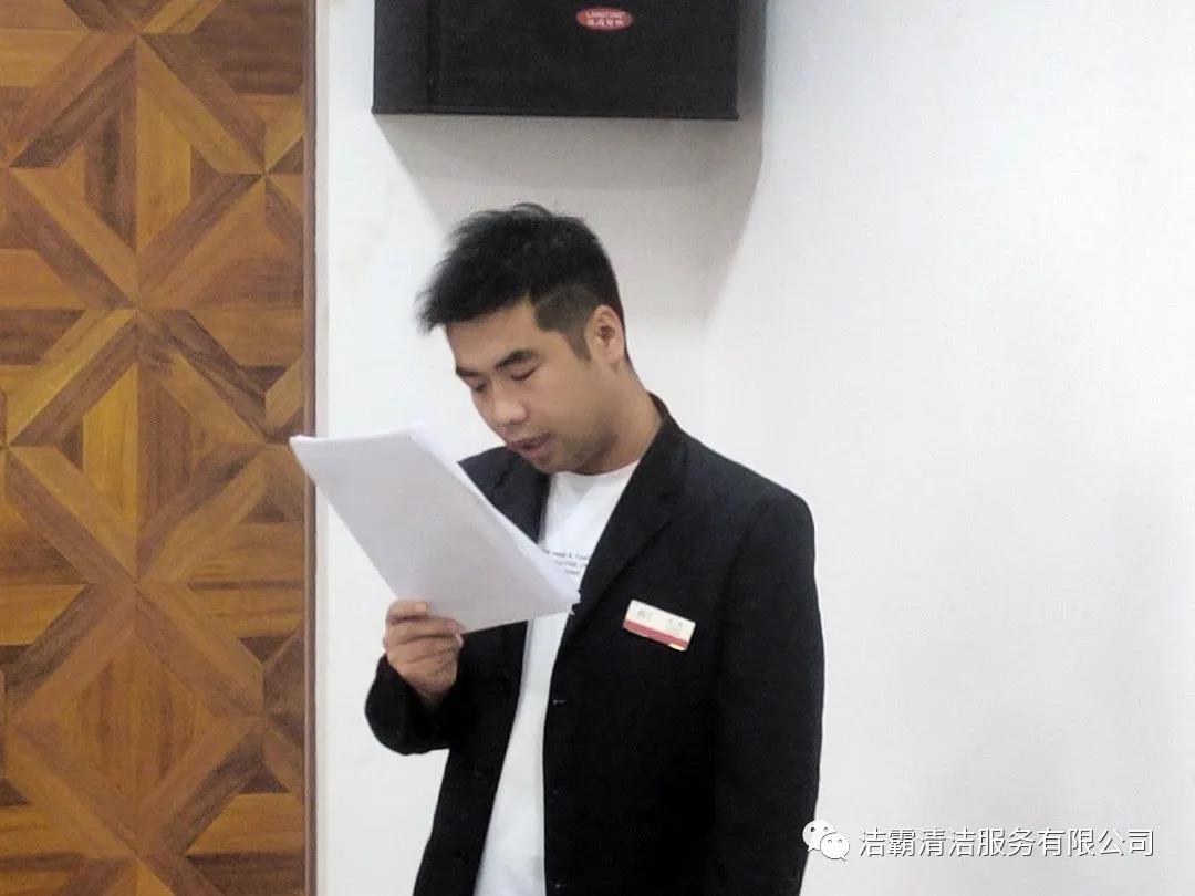 山西潔霸物業(yè)管理有限公司經(jīng)理李廣忠、會計張青霞、出納王頓花、晉城市合眾力勞務(wù)派遣有限公司經(jīng)理成濤、出納劉雨星、晉城市潔霸清潔服務(wù)股份有限公司工程部文員張陽楠、綜合辦公室車輛管理員呂衛(wèi)東、人力資源部文員呂利清、山西百潔物業(yè)服務(wù)有限公司出納王笑依次上臺作了述職匯報。