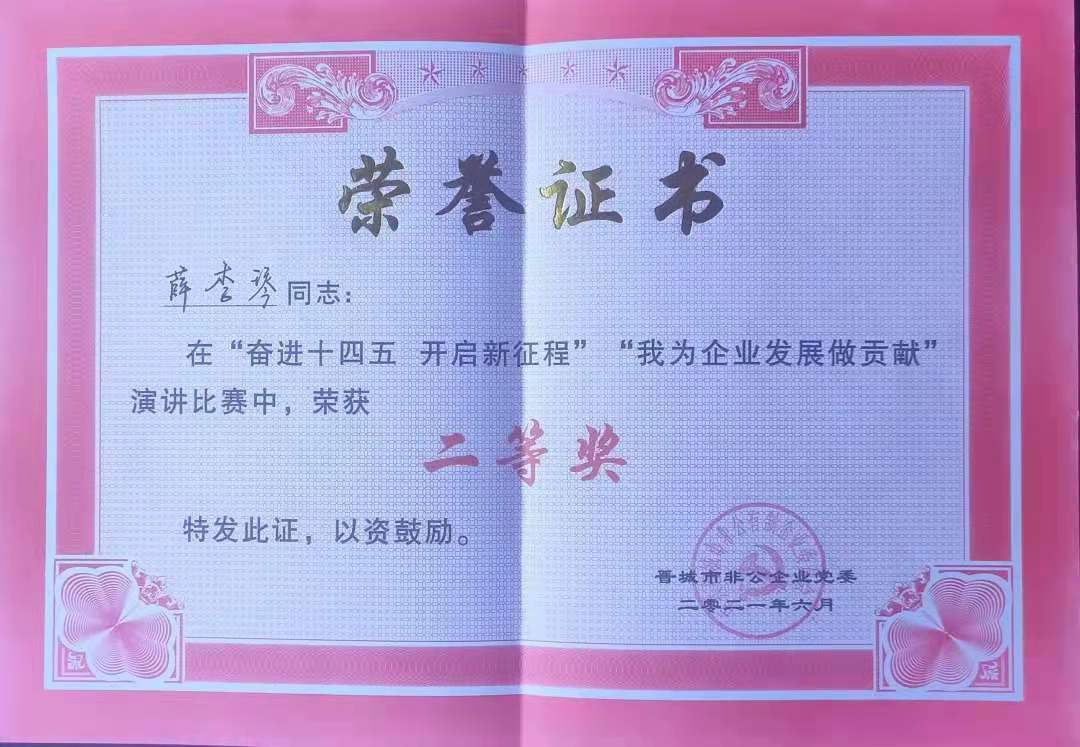 6月2日下午,晉城市非公企業(yè)黨委“奮進(jìn)十四五·開啟新征程 我為企業(yè)發(fā)展做貢獻(xiàn)”主題演講比賽決賽在市市場監(jiān)督管理局6樓視頻會議室成功舉行。我公司選手薛李琴在決賽中榮獲二等獎。