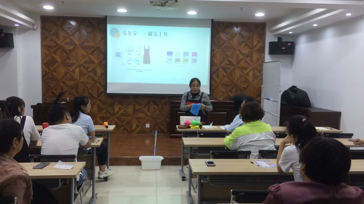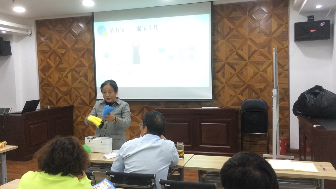 會議開場,從福建福州取經(jīng)回來的人力資源部呂利清用簡短的一句話首先點出了“潔萬家”產(chǎn)品的亮點——“1人1次4小時日常保潔服務(wù)”,接著她從服務(wù)人員、服務(wù)時間、服務(wù)內(nèi)容、保潔工具、保潔流程等方面介紹了“潔萬家”日常保潔與年關(guān)保潔以及居家保潔的區(qū)別,并對服務(wù)內(nèi)容所涵蓋的6大區(qū)域(臥室、衛(wèi)生間、餐廳、客廳、廚房、陽臺)以及專用8色保潔布的分類使用進(jìn)行了詳細(xì)的介紹。