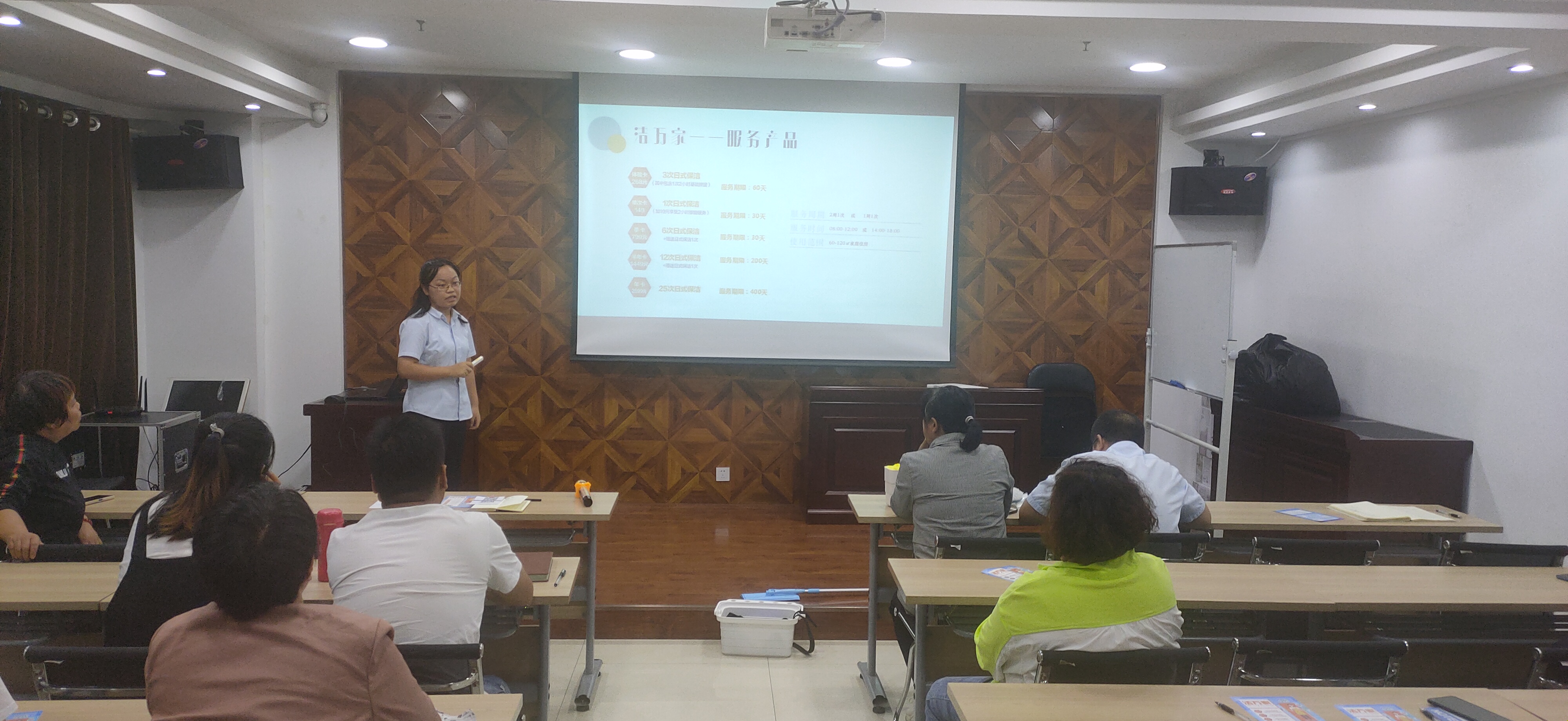 隨后由公司人力資源部負(fù)責(zé)人司夢琴對“潔萬家”日常保潔產(chǎn)品進(jìn)行了分類介紹,此外還介紹了產(chǎn)品推廣獎勵方案和推廣話術(shù),對大家日后推廣過程中會遇到的客戶提出的各種問題進(jìn)行了預(yù)設(shè)并一一詳細(xì)作答。