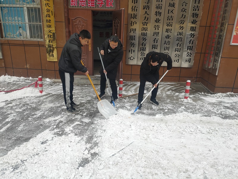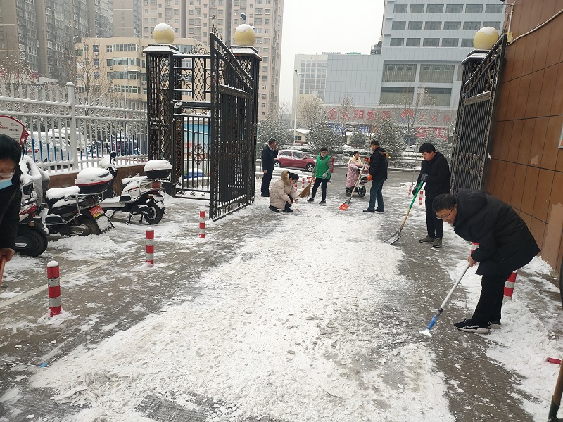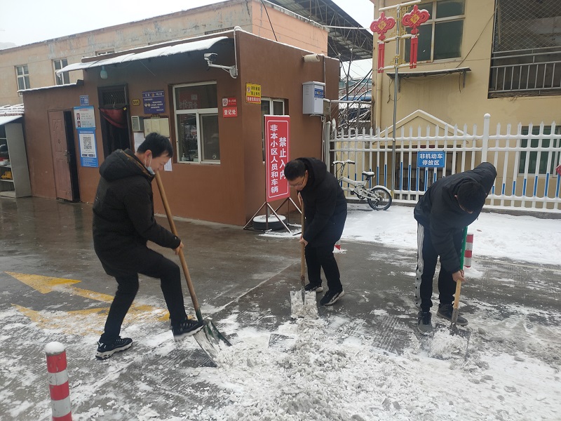 為了景西花園出行居民和公司員工的人身安全,5日早上,公司晨會(huì)結(jié)束后,由公司辦公室牽頭,潔霸員工們帶著鐵鍬、掃帚、撬棍等工具,在小區(qū)門口開展清除冰雪活動(dòng)。