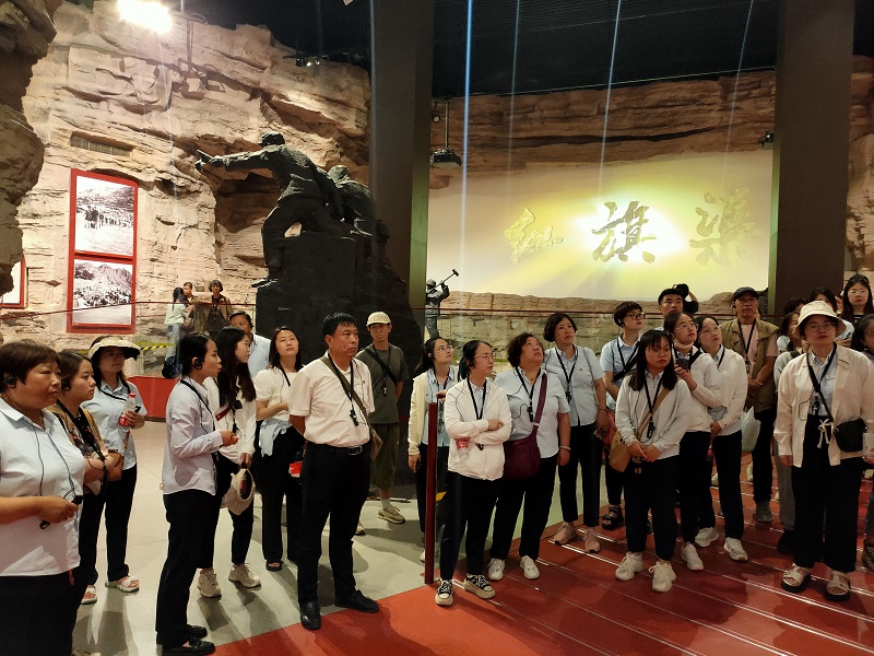 走進紅旗渠紀念館,大家跟隨講解員的腳步,在千年旱魔,世代抗爭;紅旗引領,創(chuàng)造奇跡;英雄人民,太行豐碑;山河巨變,實現(xiàn)夢想;繼往開來,精神永恒五個部分逐一駐足學習,通過一件件珍貴的物品,一幅幅生動的圖片、一幀幀震撼的畫面、一個個感人的故事,讓大家身臨其境感受到林州人民建造人工天河時不畏艱險,頑強拼搏,緊靠一錘一鏟削平1250座山頭、鑿通211個隧道、架設151個渡槽的恢弘場景。在場的各位都深深地被“自力更生、艱苦創(chuàng)業(yè)、團結(jié)協(xié)作、無私奉獻”的紅旗渠精神所感動,切實感受到中華民族勤勞堅韌的優(yōu)良傳統(tǒng),領悟社會主義是干出來的,新時代是奮斗出來的。