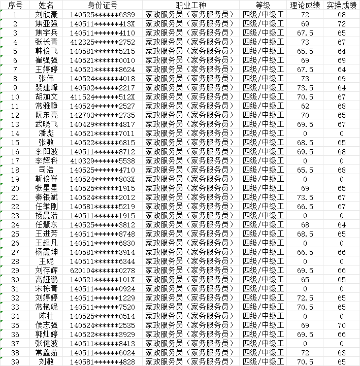 晉城市潔霸清潔服務(wù)股份有限公司職業(yè)技能等級認(rèn)定中心2024年1月28日第8批家政服務(wù)員中級認(rèn)定人員成績公示