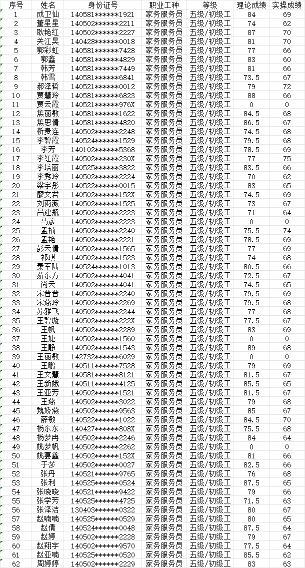 晉城市潔霸清潔服務(wù)股份有限公司職業(yè)技能等級(jí)認(rèn)定中心現(xiàn)將2024年7月20日認(rèn)定人員成績(jī)公示如下: