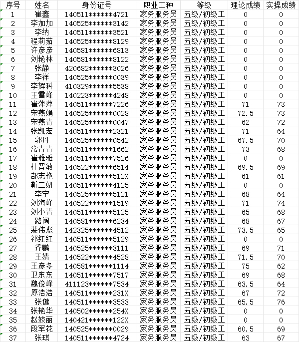 晉城市潔霸清潔服務(wù)股份有限公司職業(yè)技能等級認(rèn)定中心現(xiàn)將2024年7月21日認(rèn)定人員成績公示如下: