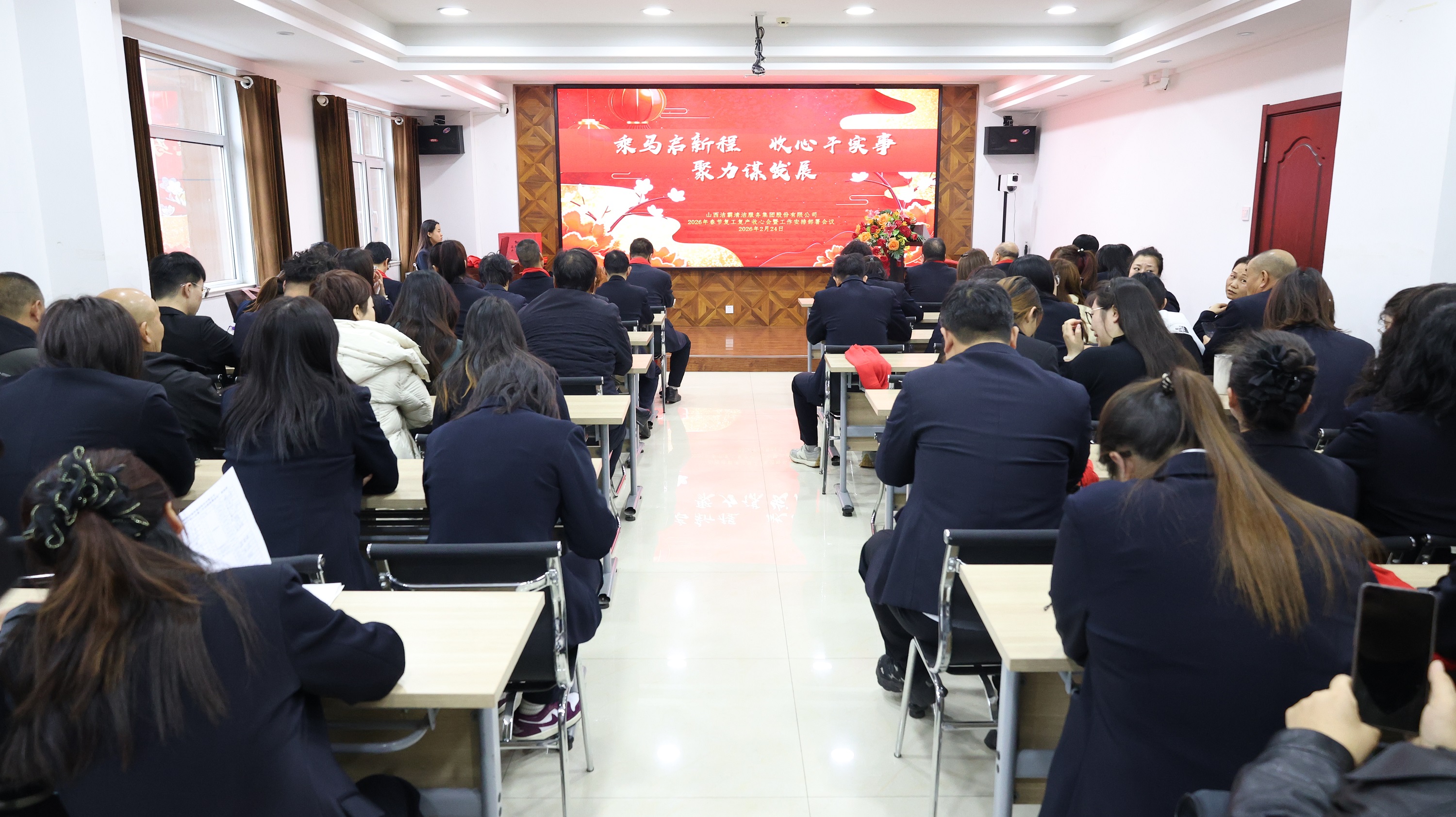 會議召開前,山西潔霸物業(yè)、合眾力勞務(wù)派遣、辦公室、保潔部、百潔物業(yè)、潔霸超市、潔霸洗業(yè)、財務(wù)部、清洗一部、清洗二部、清洗三部、運營中心、職業(yè)培訓(xùn)學(xué)校、人力資源部、智能科技等子公司和部門分別登臺展示團(tuán)隊士氣和精神風(fēng)貌,集中展現(xiàn)2026年的奮斗目標(biāo)和決心,凝聚團(tuán)隊向心力。